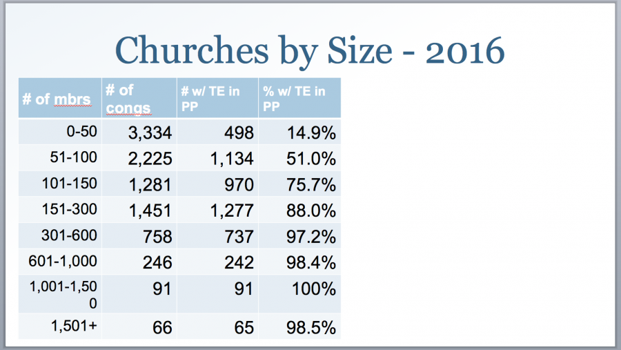 (Note: in the chart above, # or % “with TE in PP” means “number or percent of churches in that size category which have at least one teaching elder (minister) in the Pastors Participation program of the Board of Pensions: the bundled package of pension, medical, death and disability benefits that is required for installed pastors and available for other ministers of the church).
