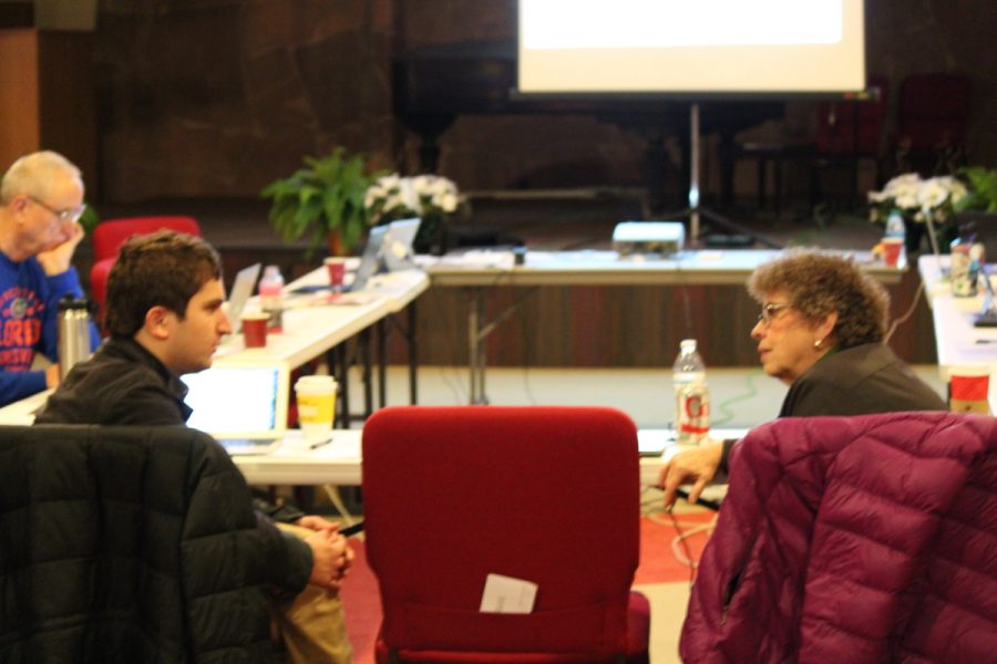Commission members Mathew Eardley and Eileen Lindner talk during a break.