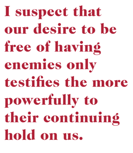 I am not a pacifist, but I suspect that our desire to be free of having enemies only testifies the more powerfully to their continuing hold on us, just as our laborious exertions to ignore this aspect of the faith only serve to undermine it while giving more power to the very enemies we deny having.