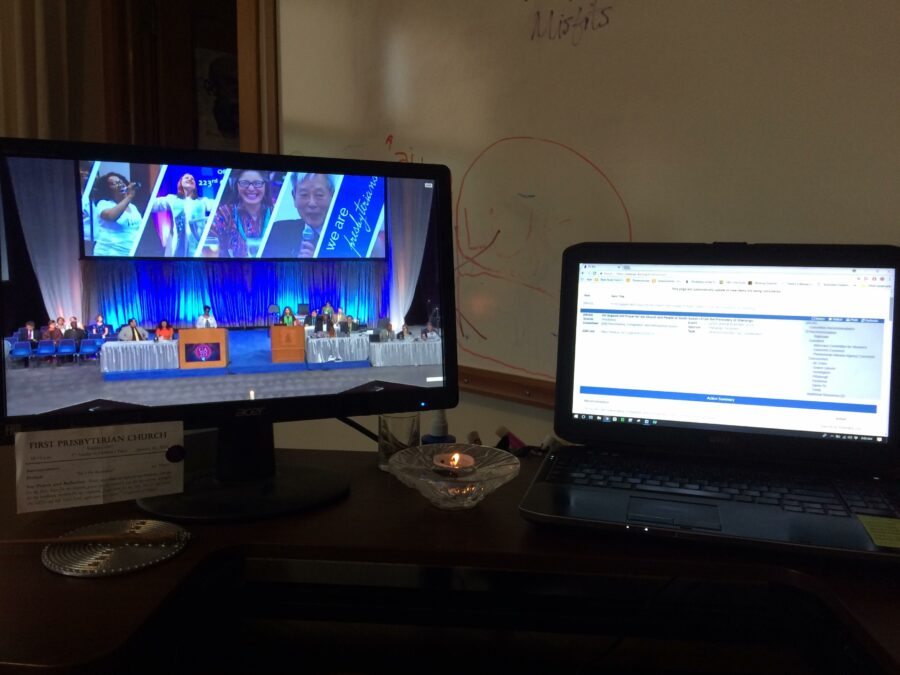 Every GA since then, I’ve spent the entire week following every moment possible from afar. I read through the overtures beforehand and flag the ones in which I have a vested interest so I can follow them more easily through the PC-Biz website. I follow #GA223, the official General Assembly accounts and my own presbytery (Presbytery of the Twin Cities Area) on Facebook, Twitter and Instagram. Whenever plenary is in session, I stream the live video feed on one screen and the PC-Biz Session Sync on the other screen so that I can follow along with what’s happening both in the discussion and in the overture wording/rationale. In the future, I look forward to opportunities to attend as an overture advocate and a commissioner. I have even been known to throw a GA watch party – complete with pizza and wine – so that some friends and I can gather and stream the live feed and PC-Biz together.