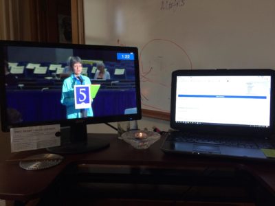 But there was another option. I signed up to be a student worker and so ended up behind the scenes. (Have you ever noticed those tired-looking people running around in blue smocks? That was me.) And I loved every minute of those 10 days that I spent setting up and taking down and passing out paper and trying to help people with all their technical issues (yikes!) and running hastily-scrawled amendments from the plenary floor backstage so they could be put up on the screen for all to read.