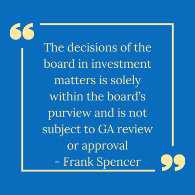 Qualifying that the Board of Pensions takes seriously the referrals of the General Assembly, Spencer went on to say that, “the decisions of the board in investment matters is solely within the board’s purview and is not subject to GA review or approval.”