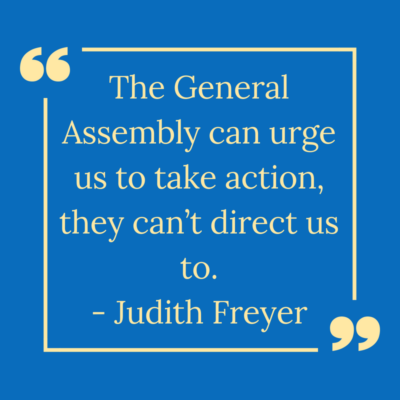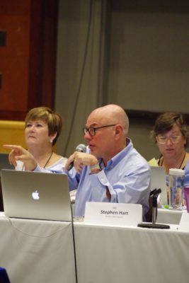Stephen Hart, a commissioner from Southern New England, asked if “the Board of Pensions is notunder the jurisdiction of the GA? … And in 08-01 … we’re calling them to command them to change … their investments. So I’d like that clarified.” Kirby restated the question for Freyer, asking: “Does the General Assembly have the authority to address the investments of the Board of Pensions?” Freyer responded: “The General Assembly can urge us to take action, they can’t direct us to.”