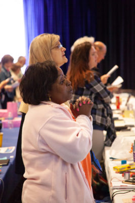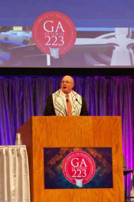 The worship started with all gathered singing a hymn in unison that included the lyrics, “We are refugees together; all are wanderers welcomed home, greeted by God’s open arms with each unique but none alone.” The text for the hymn, “Draw the Welcome Circle Wider,” was commissioned for the 223rdGeneral Assembly and was also sung during opening worship.