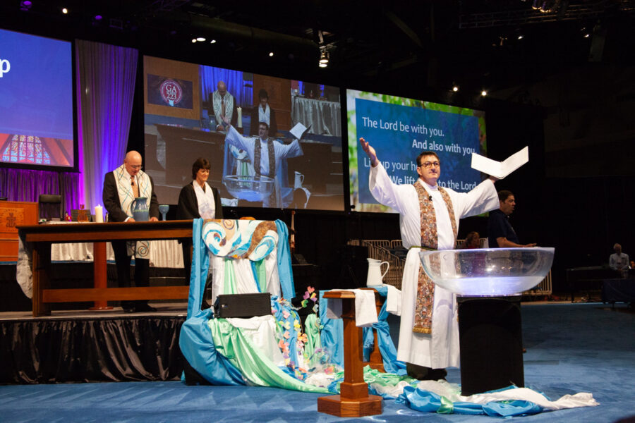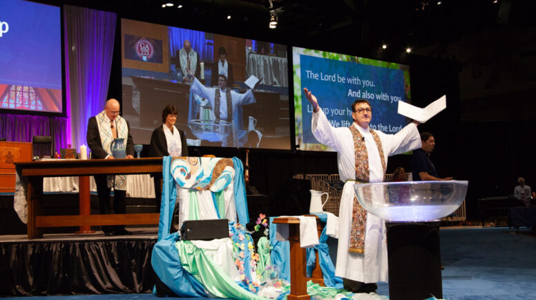 Following the call to worship, those gathered sang the classic hymn “Holy God We Praise Your Name.” Karl Hauser, pastor of Southminster Presbyterian Church in Crestwood, Missouri, led the call to confession, the prayer of confession, and the assurance of forgiveness, drawn from the new Book of Common Worship. Hauser swirled his hands through the water in the baptismal font during the assurance of forgiveness, continuing the theme of water that has flowed through all of the worship services. A microphone was placed at the baptismal font to capture the sounds of water throughout the assembly.