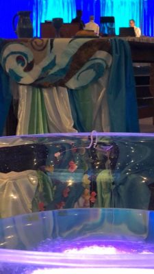 The communion liturgy was also drawn from the new “Book of Common Worship” and included a focus on both the baptismal font and the celebrants moving their hands through the water and talking about the living water from John 7 as they broke the bread and shared the cup.