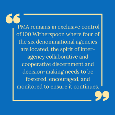 Property and facilities usage. “Topics under continued discussion include the costs and feasibility of remaining within the building at 100 Witherspoon Street, possible use of facilities to promote mission, and hospitality within each denominational building,” the report states. “While at the current time, PMA remains in exclusive control of 100 Witherspoon where four of the six denominational agencies are located, the spirit of inter-agency collaborative and cooperative discernment and decision-making needs to be fostered, encouraged, and monitored to ensure it continues.”
