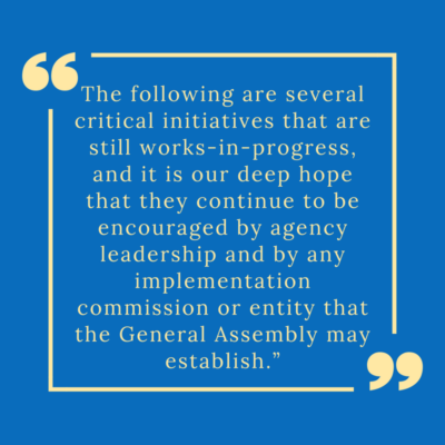 The report also states: “The ongoing Commission administrative actions during the past two years have been extremely helpful in initiating and encouraging collaborative conversations within and among national agencies that were long-needed, and the impetus of a commission often served to overcome institutional inertia. The following are several critical initiatives that are still works-in-progress, and it is our deep hope that they continue to be encouraged by agency leadership and by any implementation commission or entity that the General Assembly may establish.”