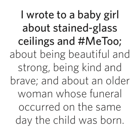 I wrote to a baby girl about stained-glass ceilings and #MeToo; about being beautiful and strong, being kind and brave; and about an older woman whose funeral occurred on the same day the child was born. As part of our witness to the resurrection, we recalled stories of this woman’s strength, how she grew up on a dirt floor and taught herself to read by the newspapers that covered the holes in the wall of her house. As long as she was alive, any child had a safe place to stay up in the holler. She used to say, “It’s so good to have someone a-watchin’ o’er you.” I wrote about the difference between watching and leering, between objectifying and empowering.