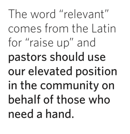 The point is not to be political from the pulpit, but rather relevant. The word “relevant” comes from the Latin for “raise up” and pastors should use our elevated position in the community on behalf of those who need a hand. If we refuse to march, if we do not write, if we take to the sidelines and do not raise our voices, then the next generation of leaders will take their causes elsewhere.