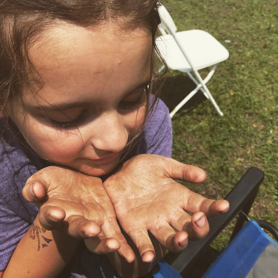 A few years later at this summer’s Wild Goose Festival, closing worship happened outdoors where much of the weekend was spent. Near the main stage was a small playground where my daughter played happily in the dirt while we worshipped. Recognizing the words of communion and seeing the people start to move toward the serving stations, she came running over and took it upon herself to douse her hands in hand sanitizer before taking the bread with now muddy but “sanitary” hands.