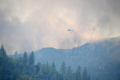 California National Guard Soldiers and CAL FIRE crew members continue to fight the Carr Fire with water-drop efforts from a UH-60 Black Hawk over Shasta County, California on August 4. (U.S. Army National Guard photo by Sgt. Lani O. Pascual, CC BY 2.0)