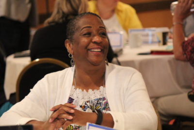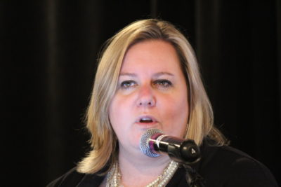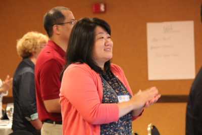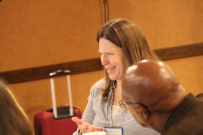 Lindsay Harren Lewis speaks during small group discussions about the board’s culture.