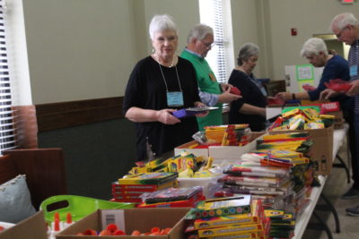At First Presbyterian Church in McAllen, volunteers assembled bags of school supplies that would be distributed to children in Mexico through a cross-border partnership called CUPS, or Comunidades Unidas Pro Salud. At another table, Presbyterians packed hygiene kits with toothbrushes, soap, shampoo, and more that would be sent to the Humanitarian Respite Center operated by Catholic Charities, where asylum seekers who have been released from detention come for shelter before they are sent out on Greyhound buses across the country.