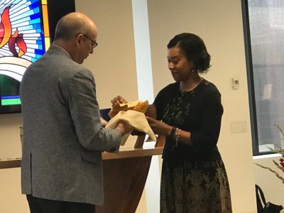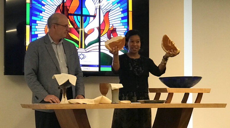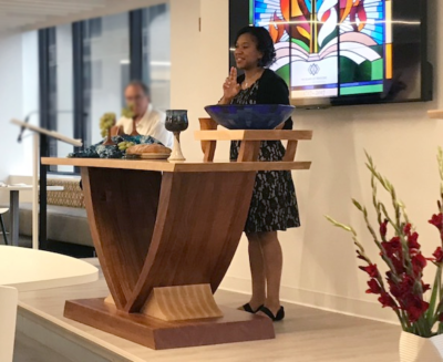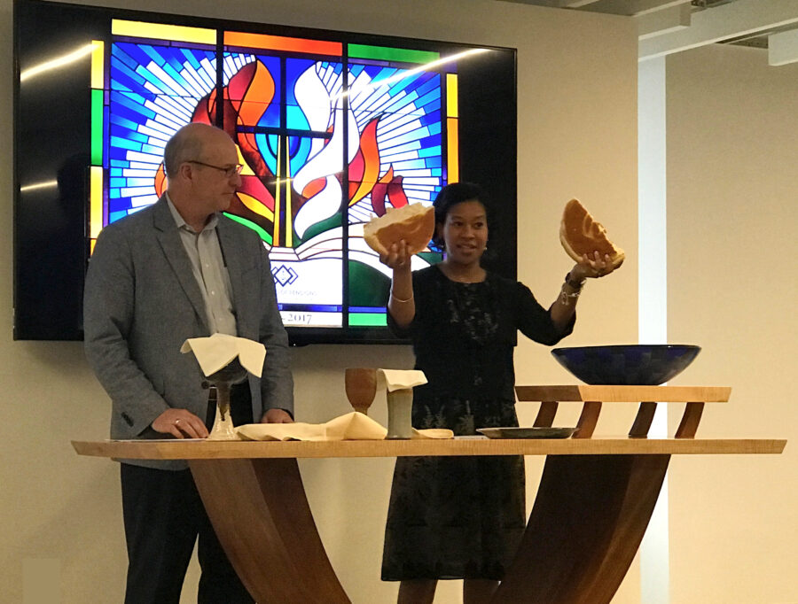 The Reverend Dr. José Irizarry, the Board’s Vice President, Education, planned the dedication service, and the Reverend Ayana Teter, Associate Church Consultant, delivered the reflection in Town Hall, the centerpiece of the Board’s newly renovated offices. The multifunctional space is large enough for the entire staff to gather together. Employees share lunch and hold small meetings in the space, and it is used for prayer and worship services and other significant gatherings.