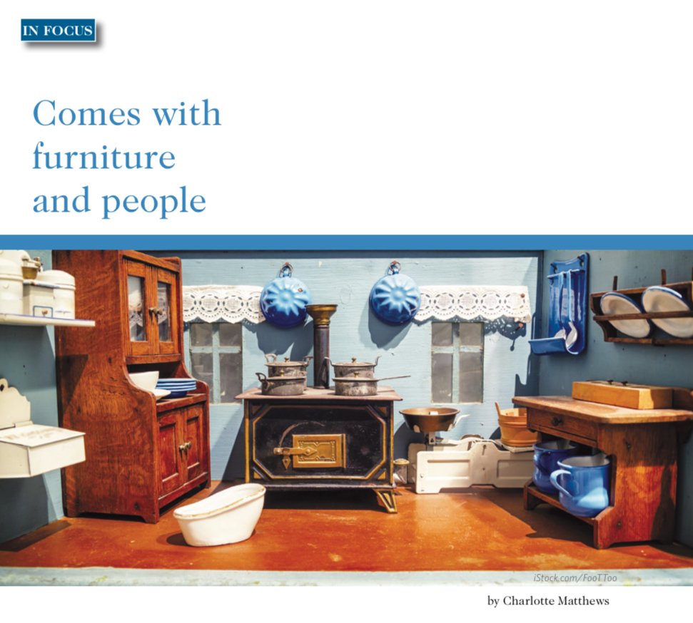 Reading the local paper, I come upon a listing for a dollhouse. The ad states that it comes with furniture and people. Take a moment to think that one through: comes with furniture and people. My grandfather made my mother a dollhouse. Its roof is green and the fake logs in the living room light up a wondrous garnet red. I love the thing, but could never get anyone to play with it — except my brother. At 7 I did not understand he was gay or that his husband would end up collecting Barbie dolls, so I felt indebted to him that he would choose to spend his time padding the little people up the stairs and making them talk in distinctive voices. He even went “up we go” as he moved their legs to escort them over the hall landing. The dollhouse was exquisitely furnished: oriental rugs, a Hoosier cabinet in the kitchen, four-poster twin beds in the children’s room.