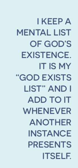 A list is something you can add to, gradually. It is something to look back on. You can check things off and feel good about it. But with my “God exists list” I never check things off. I only add. Yesterday it was a heart-shaped puddle on a city road where I found myself lost. That heart was a kind of cairn, an indication of a path, a way through, a beguiling glimmer of sun in a puddle, a sign that I might not be lost after all.
