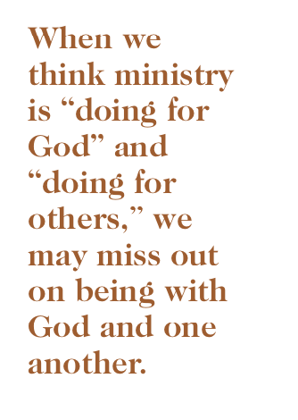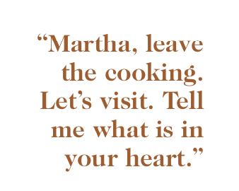For Martha, hospitality was important. Cooking a wonderful meal was important. However, like Martha, when tasks or activities become more important than relationships, we focus more on doing than relating; we care more about outcomes than being present. Similarly, when we think ministry is “doing for God” and “doing for others,” we may miss out on being with God and one another. We become outcome-driven rather than relationship-oriented. We forget that love is the most important focus, not accomplishments or outcomes.