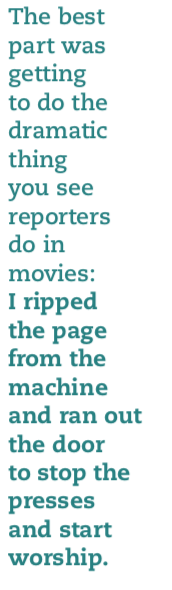 At the last minute before the evening jazz worship service, I realized I needed to write a prayer for the service. The Wi-Fi was down and I couldn’t connect to a printer to print. I cranked a sheet of paper into that typewriter and banged out my prayer. It was full of typos, but the experience was illuminating. The steady sounds of the typewriter doing its job centered me and let me focus. The resulting prayer had much more presence in it. Because I couldn’t erase, I was sure I meant every word in there. The best part was getting to do the dramatic thing you see reporters do in movies: I ripped the page from the machine and ran out the door to stop the presses and start worship.