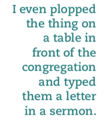 I started using that typewriter for all sorts of stuff: notes to new members (big hit), sermons, prayers, blessings, idea brainstorming. I even plopped the thing on a table in front of the congregation and typed them a letter in a sermon. This year, after being called to a congregation in California, I offered typed “blessings while you wait” at the church’s spring festival. I was mobbed by kids the entire time as they tried to type their names on my machine with their thumbs like they would on a phone.