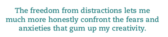I am also very prone to distraction. I crave the flow of getting lost in a creative task I really enjoy and feel called to. At the same time, as a lot of creative people do, I wrestle with a lot of fear and doubt in my work. Beginning is the worst. I procrastinate a lot — not from laziness, but because I am scared. What if God doesn’t show up this time and I don’t end up with anything to say? What if my prayer comes out as evocative as a grocery list? Am I really called by God to preach to these people or am I just saying what I want to say and damaging their faith in the process? I am full of these questions as I approach an empty page and try to start writing. I look for any excuse to not start because if I never start writing (so goes the distorted message in my head), then I haven’t failed.