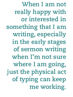 There’s also one more piece to it — something harder to pin down, and I’m not sure I can convey it without sounding like I am making a typewriter into a magic conduit to the divine. There is a sensation to typing on a typewriter that I really like. The way it physically feels, looks and sounds to put words on the page has its own momentum. And that keeps me at the desk and working. When I am not really happy with or interested in something that I am writing, especially in the early stages of sermon writing when I’m not sure where I am going, just the physical act of typing can keep me working. I think my brain gives me a little endorphin dose from the physicality and sensation of typing. When I am really in a groove, the movement of the little arms that swing up and print the letters feels as inevitable as ocean waves. They will keep coming, in spite of my lack of faith in what I am trying to say, because the moon or God wills them so. There is a lot of grace in that, for me at least, because it doesn’t take much for me to want to give up. That little bit of encouragement feels designed into the machine. There is just enough of the Spirit working in the mechanism to see me through to the end of whatever I’m working on. I am terrible at beginning to write but there is no better feeling than finding an ending that you can believe in.