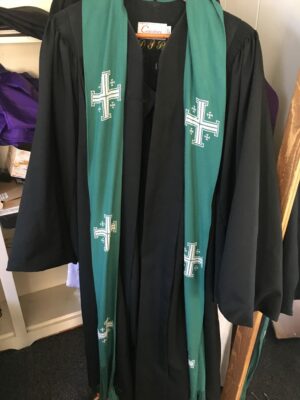 On June 21, I led a funeral at the funeral home for the mother of one of our members. I wore the “traveling robe” shared by my sisters in ministry. It was two weeks before my due date, and someone commented that I looked “big.” It was a well-meaning older lady who was quickly scolded by her entire family. I didn’t know the woman who died, so I did the best I could with my message. I talked about the journey of life, and how the journey is not exactly over but just beginning for her. That night I started to feel contractions, they got closer together throughout the next day, and on June 23, I gave birth to my second daughter.