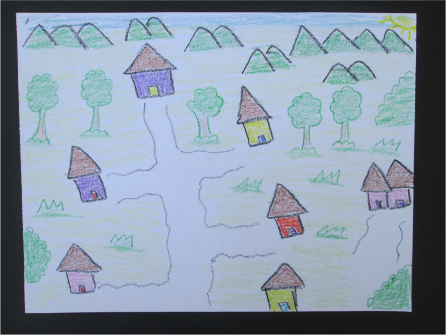 Laura, “Mi comunidad” (My community), crayon, 2014 9 x 12, Arte de Lagrimas Gallery. Laura is 15 years old from El Salvador. In this picture, she drew her community: a serene horizon and multicolored houses.