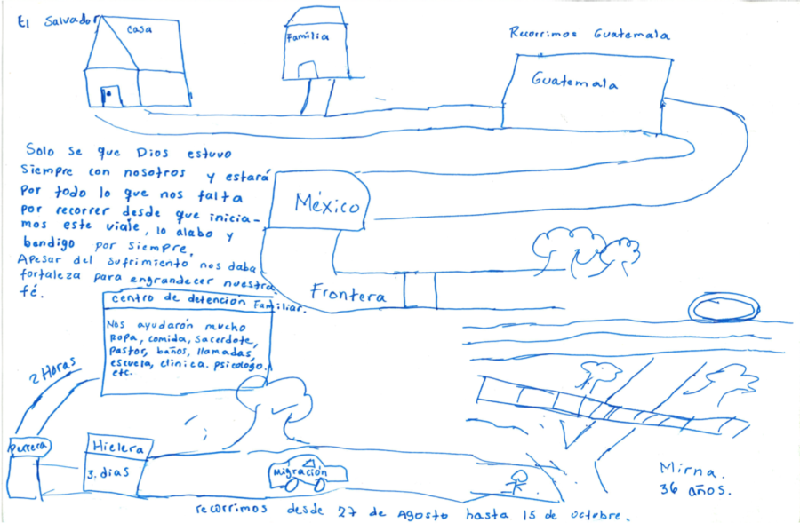 At the bus station, “we’d sit with the children and give them lap boards and pieces of paper and a box of colors, and they’d just start drawing,” Cuéllar said. “A lot of the children asked us what to draw. I had informed the volunteers that, based on my own research on exile and my readings of the biblical texts, two safe art tasks would be ‘Draw your journey’ or ‘Draw your house.’ So that’s what we would tell them. Draw your journey.”