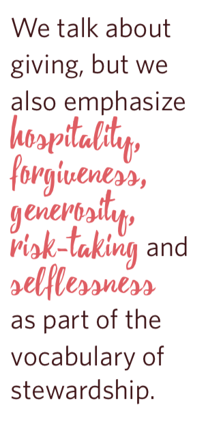 The beauty of holding this work in community is that it is evolving as we speak. We work on, wrestle with and pray about how we lead faithful and fruitful stewardship in our congregation. We accept failure as part of the life cycle of ministry and we stay open to the risks of innovation. Our commitment to the work comes from strong support of our senior leadership and our sense that developing stewards who take love seriously really matters for the health of our church and the world.