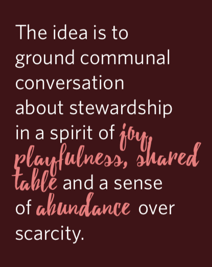 Here are some of the methods that we’re trying in our context that have been helpful in that they are integrated year-round and rooted in an understanding of stewardship as a spiritual practice for transformation. We think of the day-to-day work of stewardship in our church as creating lots and lots of invitations for learning about and participating in stewardship practice as a way of life. Our approach involves some parts related to the stewarding of money, but is ultimately broader and deeper in its focus.