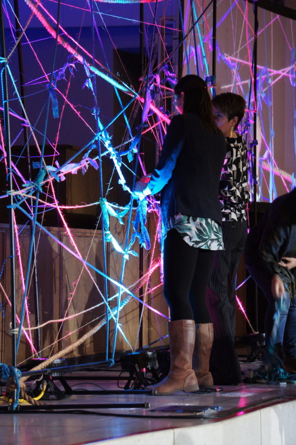 The theme of tearing and mending continued throughout the service as pieces of cloth were audibly torn, knotted together and then tied to connect to the fabric of one another in pews. The strands of fabric were collected and incorporated into the large scaffolding of colorful string on the chancel. Azada noted, “Building of community is a volitional choice, chosen daily.” As Christians, then, “How do we become the beloved community for the world?”