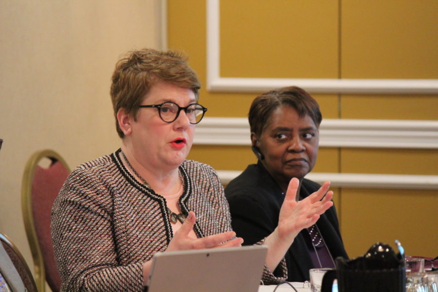 Cindy Kohlmann, co-moderator of the 2018 General Assembly with Vilmarie Cintrón-Olivieribrought greetings to the A Corporation Board on behalf of both co-moderators, as Cintrón-Olivieri was not able to attend because of illness. Kohlmann thanked the A Corporation Board members for their service to the church, saying that the work, while technical, “is about building up the body of Christ.”