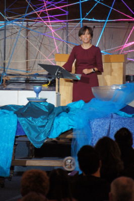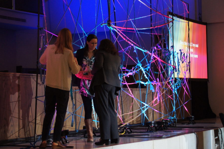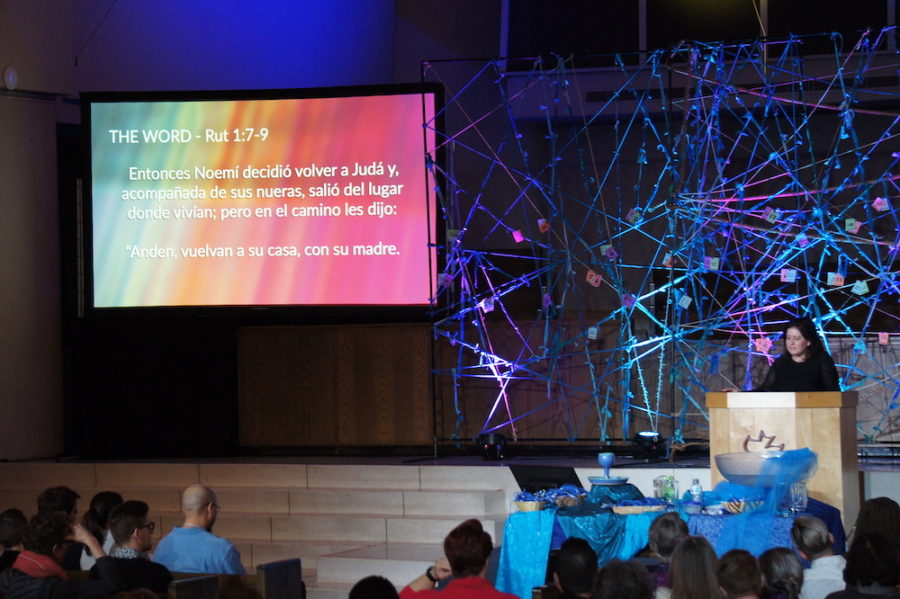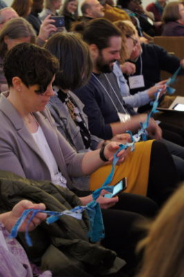 On the first day, Mary Ellen Azada, of Fuller Seminary, used the story of Ruth to invite worshippers to consider the complexity of communities that are so tightly-knit that it becomes difficult for others to enter. Worshippers ripped pieces of fabric into strips that were then tied together to create long, knotted ropes that adorned the sanctuary and served as the backdrop for worship the rest of the conference.