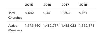 In 2015, the total number of PC(USA) members was listed at more than 1.5 million. Within a year, membership declined by nearly 90,000. Last year, the decline was just over 62,000. The number of churches leaving the denomination between 2015 and 2016 totaled 203. In 2018, it was 34.