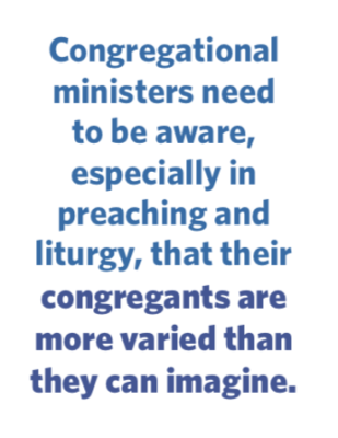 Congregational ministers need to be aware, especially in preaching and liturgy, that their congregants are more varied than they can imagine. There are people in the pews who may struggle with rejection by loved ones, with self-doubt or self-hatred, or who may need to celebrate with others the embrace of who they are. Above all, in language and expression, we, the church, must at all times assure all who hear us speak in the sanctity of the pulpit. As one who has been saved by the church teaching that God loves me and who has preached the love of God to many who believe they are outside of God’s love, I encourage pastors everywhere to take their call to preach the good news seriously.