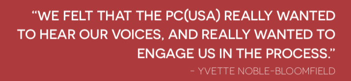 Yvette Noble-Bloomfield, an ecumenical representative to the Presbyterian Mission Agency Board from the United Church in Jamaica and the Cayman Islands, said she participated in the Latin America and the Caribbean consultation, and “we felt that the PC(USA) really wanted to hear our voices, and really wanted to engage us in the process.”