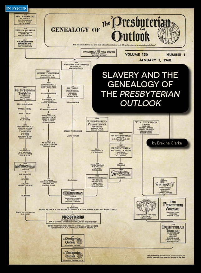 Religious papers and journals multiplied in the slave economy of the antebellum period. And among these multiplying papers and journals were ancestors of the Presbyterian Outlook. Their editors are our great grandfathers whose legacies rumble deep within us despite our modern illusions about our freedom from history. No more than Wendell Berry, the Outlook and its family of readers cannot be free from its entanglement in the lives of enslaved black men, women and children. Indeed, the genealogy of the Outlook can help white Presbyterians today know ourselves better and understand more clearly the deep impulses that help to shape our responses to the racism surging through our national life. We can see in the Outlook’s history how people of good intentions can go so badly astray, how the self-interests of daily life can seduce us and how even reformers and progressives can provide ideological support for a deeply oppressive system. And in all of this we can perhaps catch glimpses of truth about ourselves — truth that is complex and ambiguous and at the same time demands a decision: that we stand on one side or the other in the great struggles of our time.