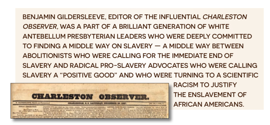 Benjamin Gildersleeve was the editor of the influential Charleston Observer. Located in Charleston, South Carolina, the wealthiest city in the country, he was a part of a brilliant generation of white antebellum Presbyterian leaders who were deeply committed to finding a middle way on slavery — a middle way between abolitionists who were calling for the immediate end of slavery and radical pro-slavery advocates who were calling slavery a “positive good” and who were turning to a scientific racism to justify the enslavement of African Americans. Gildersleeve believed that such “extremes” were dangerous and distorted the true character of American slavery. He sought a middle place not simply as a practical place but as the place where truth most likely resided. He, like so many other Presbyterians of his time, believed the Proverb when it declared, “I wisdom dwell with prudence.” To be prudent meant not to run ahead of providence, to let slavery die in God’s own good time and, in the meantime, it meant to try to make the institution of slavery more humane and to help prepare enslaved people for their eventual freedom. So he published articles that advocated a paternalistic concern for the enslaved without calling for an end of the system of slavery.
