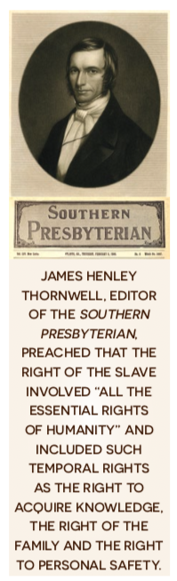 Thornwell’s inaugural sermon, preached to whites only, was the most comprehensive statement of Presbyterian paternalism in the antebellum South. He challenged the assumption of abolitionists that the heart of slavery was the ownership of another person. Rather, Thornwell made a stunning definition of slavery — that the right of the master was only to the labor of the slave. That was, he said, all that a Christian could concede about the rights of masters. The right of the slave, on the other hand, involved “all the essential rights of humanity” and included such temporal rights as the right to acquire knowledge, the right of the family and the right to personal safety. Such rights were sacred, and the state had a responsibility to protect them for the slave.