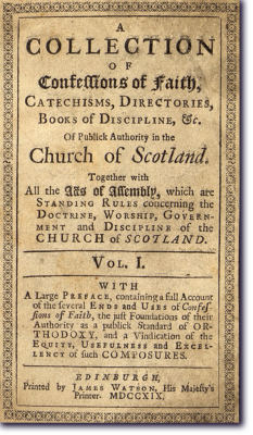 Among the rare books preserved inside the National Archives of the PC(USA) is William Dunlop’s A Collection of Confessions. Published three hundred years ago in Edinburgh, Scotland, the two-volume set brought together the Westminster Standards (1647-48), the Geneva Catechism (1542), the Scots Confession (1560), and the Heidelberg Catechism (1563). As the bulletin insert notes, Dunlop’s compilation placed the relatively new Westminster Standards (including the Westminster Confession) alongside classic texts of Reformed, or “Calvinist,” theology.