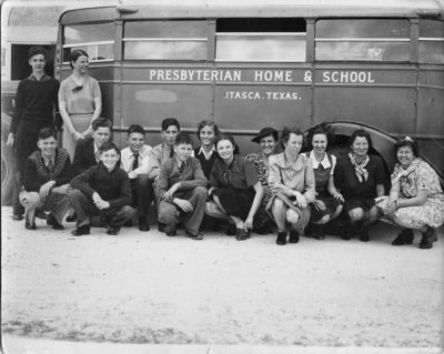 Residents gather around the school bus at the Presbyterian Home & School in Itasca, Texas.
