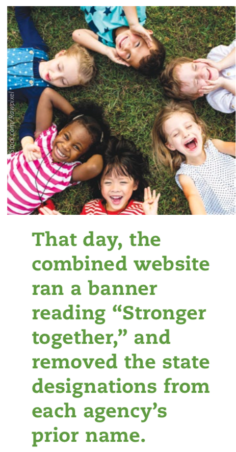 By 2017, the trustees and senior staff of both agencies felt the time was right to discuss the possibility of a merger. Knight announced his intention to retire at the end of 2017 and the trustees of each board were beginning to rotate off. After several discussions by a joint committee to explore merger, both boards unanimously voted to merge on January 1, 2018. That day, the combined website ran a banner reading “Stronger together,” and removed the state designations from each agency’s prior name.