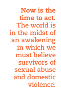 Now is the time to act. The world is in the midst of an awakening in which we must believe survivors of sexual abuse and domestic violence. Churches must take a stance. Now is the time to end violence against women.