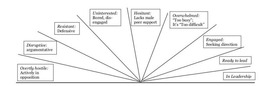 Funk sees this as a “very rich moment globally.” Conversations are taking place all around the world about gender equity. When considering how men will react to these conversations, Funk likes to use a continuum. Some men fall on the far end of the continuum and will be hostile and defensive.