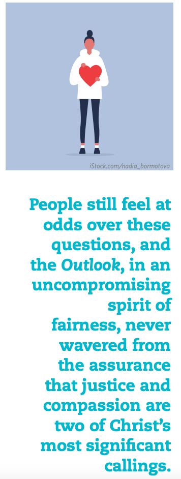 Again, articles in the Outlook presented differing ideas: Is homosexuality a sin? Where do transgender people fit in? People still feel at odds over these questions, and the Outlook, in an uncompromising spirit of fairness, never wavered from the assurance that justice and compassion are two of Christ’s most significant callings.