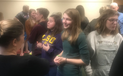 Next, the two led workshop participants in what Hébert called “a safe form or story-telling.” With an inside circle facing out and an outside circle facing in, students paused for a while, then told the student facing them a two-minute story of something that happened to them that was important to their faith development. After hearing from their counterpart, one circle would shift so that eventually, everybody heard everyone else’s story.