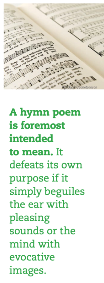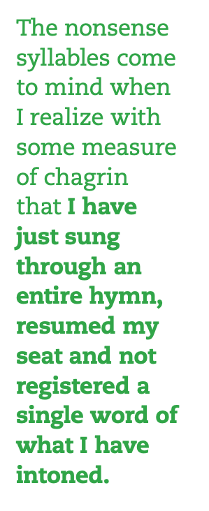 I think about such exercises occasionally now that I am part of the congregational choir that sits in the nave of the church rather than the choir loft. The nonsense syllables come to mind when I realize with some measure of chagrin that I have just sung through an entire hymn, resumed my seat and not registered a single word of what I have intoned. I might just as well have been vocalizing on “lu.” While I doubt I am the only person to have had this experience, I am all the more sheepish about admitting to it, because I should surely know better. After all, I am a professional hymn text writer with a decades-long commitment to studying the genre. So I am prompted to ask, both for myself and for others: Do I – or we – really mean what we sing?