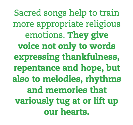 However, we may also mean what we sing in ways beyond the conscious and cognitive. After all, being a Christian is not simply assenting to doctrines, but also living out a pattern of deep affections: gratitude for God’s gifts, love for God and neighbor, sorrow for our own sin and grief over the ills of the world, and earnest desire for redemption. If we profess to be Christian yet act in ways that are predominantly grudging, mean-spirited and despairing, something about our faith-claim rings false. Sacred songs help to train more appropriate religious emotions. They give voice not only to words expressing thankfulness, repentance and hope, but also to melodies, rhythms and memories that variously tug at or lift up our hearts. Even the chemicals released in our brains by the act of singing may play a role in such emotional training. And why not? We are embodied beings and worship is a bodily act.
