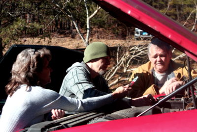 Right now, he’s helping a young woman with a 19-month-old baby whose pickup truck is loaded with food, but won’t start. It’s her grandfather’s, and the battery is old and the license tags expired; her own truck is in the shop. Reed props up the hood and a trio of guys goes to work, fiddling and adjusting, trying to jump the battery. Russell darts up the hill to help, pulling a tool from her pocket, sliding down and shimmying under the truck to check out the problem from there.